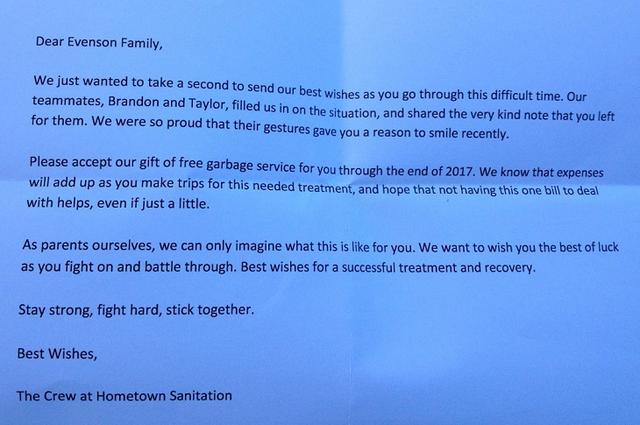 The letter continued to say, “Please accept our gift of free garbage service for you through the end of 2017. We know that expenses will add up as you make trips for this needed treatment, and hope that not having this one bill to deal with helps, even if just a little.” With all the heartbreak, there was good news to come for everyone.